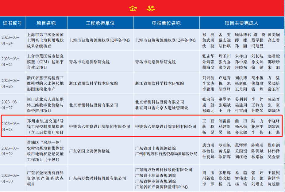 第一届中国测绘地理信息大会于11月8日-10日在浙江德清成功举办,会上揭晓了“2023年全国优秀测绘工程奖”名单并举行颁奖仪式。中铁六院测绘院承担的“郑州市轨道交通5号线工程控制测量检测(含工后监测)项目”荣获金奖殊荣。这是继2020年西安市地铁四号线TJSG-11标火车站站南竖井及一期暗挖隧道下穿国铁站长施工期间自动化监测项目勇夺金奖之后,中铁六院测绘院再次获得的工程测绘行业的最高奖项!
